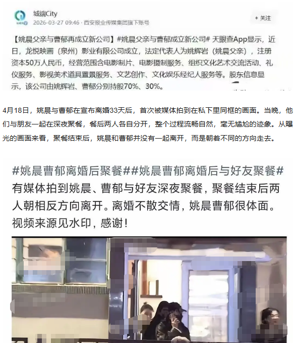 姚晨和曹郁官宣离婚才4天,一个爆炸性消息就来了:曹郁和姚晨的父亲在泉州注册了一家新公司。前夫和前岳父合伙做生意,这操作直接把“离婚即翻脸”的剧本撕了。
