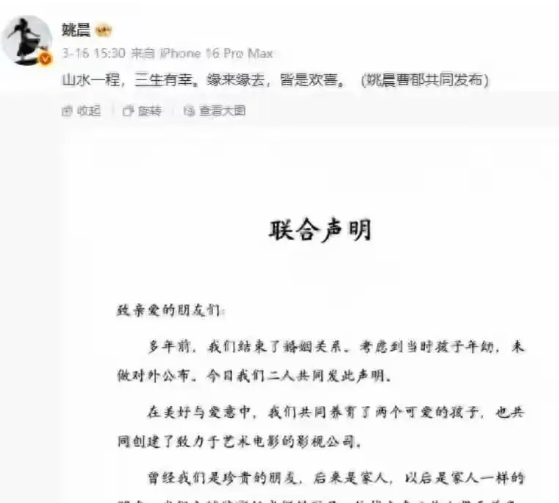 演员姚晨和摄影师曹郁在各自的社交账号上,同步发布了一份联合声明。声明里说,他们“多年前”就已经结束了婚姻关系,考虑到当时孩子年幼,所以没有对外公布。声明用“山水一程,三生有幸。缘来缘去,皆是欢喜”来形容过去,并承诺未来会以“家人一样的朋友”身份,继续共同守护孩子,在工作上也会携手并肩。