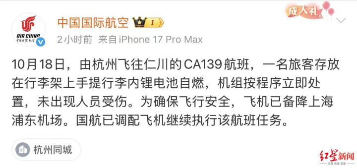 10月18日12时39分,中国国际航空发布情况通报,称当日由杭州飞往仁川的CA139航班,一名旅客存放在行李架上的手提行李内锂电池自燃配资平台导航,机组按程序立即处置,未出现人员受伤。为确保飞行安全,飞机已备降上海浦东机场。国航已调配飞机继续执行该航班任务。